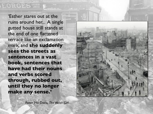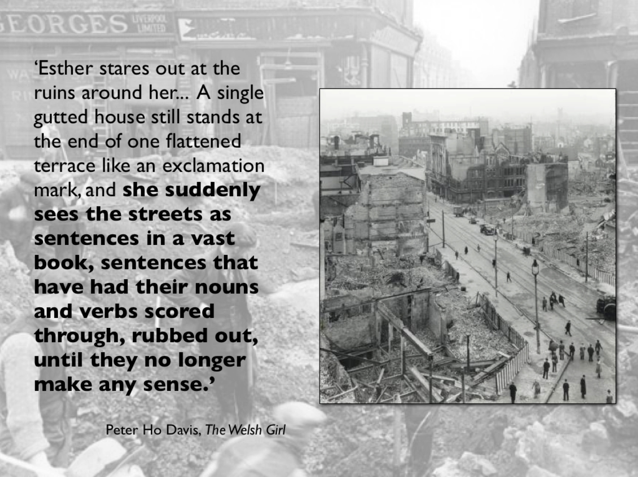 ‘The Allied air assault on the great European conurbations suddenly became a son-et-lumiere, a series of special effects, an atmospheric projection designed to confuse a frightened, blacked-out population.  In dark rooms that fully accorded with the scale of the drama, victims-to-be witnessed the most terrifying night-time fairy theatre, hellish displays of an invading cinema that reproduced the Nuremberg architecture of light.’