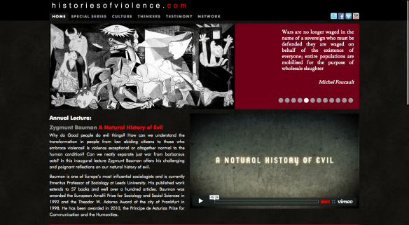 I should have mentioned this before: Brad Evans, whose Foucauldian riffs have opened up a series of arresting perspectives on contemporary (‘liberal’) war, has a resource-rich website for his Histories of Violence Project.   It includes a series of cultural interventions, including an interview with Tom McCarthy and a reading from his novel “C”, a clutch of talking-head’ lectures on thinkers like Arendt, Bauman, Butler, Fanon and Foucault, and a special series of videos to mark the anniversary of 9/11, ‘Ten years of Terror’, including Zygmunt Bauman, Mick Dillon, Steve Graham, Michael Hardt, Mary Kaldor, Brian Massumi, Cynthia Webber – and Brad himself.