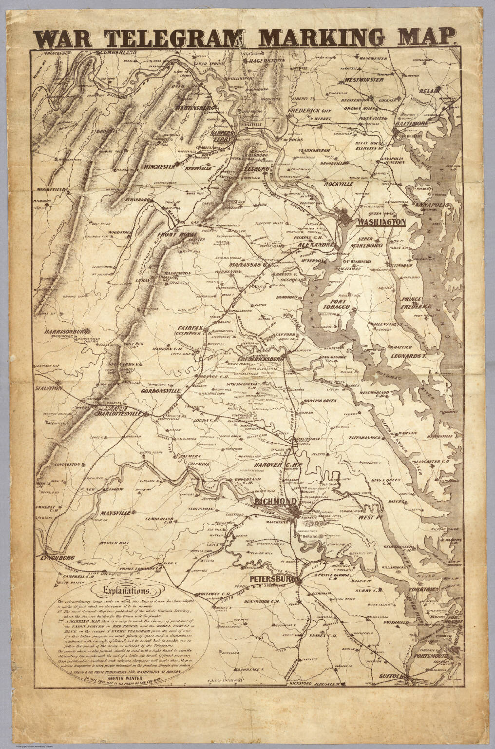 As this suggests, Favret’s interests direct her attention to the literary world – especially poetry  – and in doing so she usefully reminds us that the emergence of the public sphere in eighteenth-century Britain involved more than spaces of rational articulation, which is why she constantly appeals to a landscape of affect.  Yet the response to distant violence was increasingly also a matter of report, comment and debate, which allows more formal calibrations of ‘eventfulness’ through the press.  Here, as in much else, I’m indebted to Allan Pred’s luminous work on the circulation of information, but I’m most interested in the emergence of a transnational public sphere that, after Morse’s successful demonstration of the telegraph in 1844, was increasingly an electric sphere: and one that transformed public awareness of ‘war at a distance’.  So my discussion of information begins with the Crimean War (which saw the birth of the war correspondent) and the American Civil War (usually seen as ‘the first telegraph war’).  In the latter, the telegraph played a vital role in communications, intelligence (by virtue of being tapped) and logistics, but I’m particularly interested in the sense of immediacy conveyed through wire reports.  Louis Prang devised this map, sold through news-stands in Northern cities, so that readers could follow the progress of the war in more or less real time: