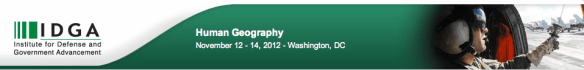 The Institute for Defense and Government Advancement (IDGA) – which describes itself as ‘a non-partisan information based organization dedicated to the promotion of innovative ideas in public service and defense’ and which ‘is not affiliated with the US government or any branch of the Armed Services’ – is holding a Human Geography Summit in Washington DC, 12-14 November 2012. Subtitled ‘Maximizing force efficiency through intelligence in the human domain’, the brochure explains: