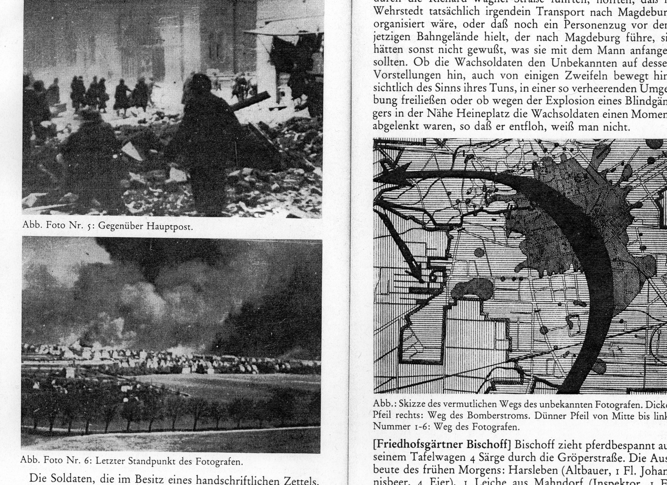 ‘“The Air Raid on Halberstadt on 8 April 1945” consists of thirty vignettes. The majority are accounts of what the residents of Halberstadt did during the air raid, where they were, what they were thinking, and whether they survived. These stories “from below” are interrupted for a twenty-two-page segment about “Strategy from Above,” a documentary montage of interviews with pilots, images of bomb schematics and flight formations, and pictures of pilots. The documentary aspect of Kluge’s Halberstadt essay and his Neue Geschichten [‘New Histories’] as a whole is a ruse. Rather than lend the text authenticity, Neue Geschichten uses a feigned documentary to debunk the authority of the documentary, to undermine the validity of a singular point of view, and thereby to buttress the usefulness of montage. For Kluge, montage is superior to documentary because it is “the form-world of connectivity.” In other words, while montage creates quasi-unreal perspectives with hyperconnectivity, it simultaneously contains productive political processes in which fractured factual elements articulate within a field of possibilities.’