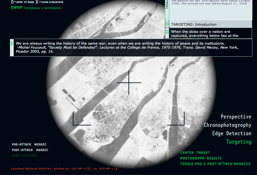 Vectors from USC has reappeared after a (too) long hiatus.  I first encountered Vectors through Caren Kaplan‘s Dead Reckoning project that tracked what she called ‘Aerial Perception and the Social Construction of Targets’.  This was in 2007, when my own interest in targeting and bombing was just kicking in as a reaction to Israel’s war on Lebanon the previous year (see ‘In another time zone…’ in DOWNLOADS).  She introduced the project like this:
