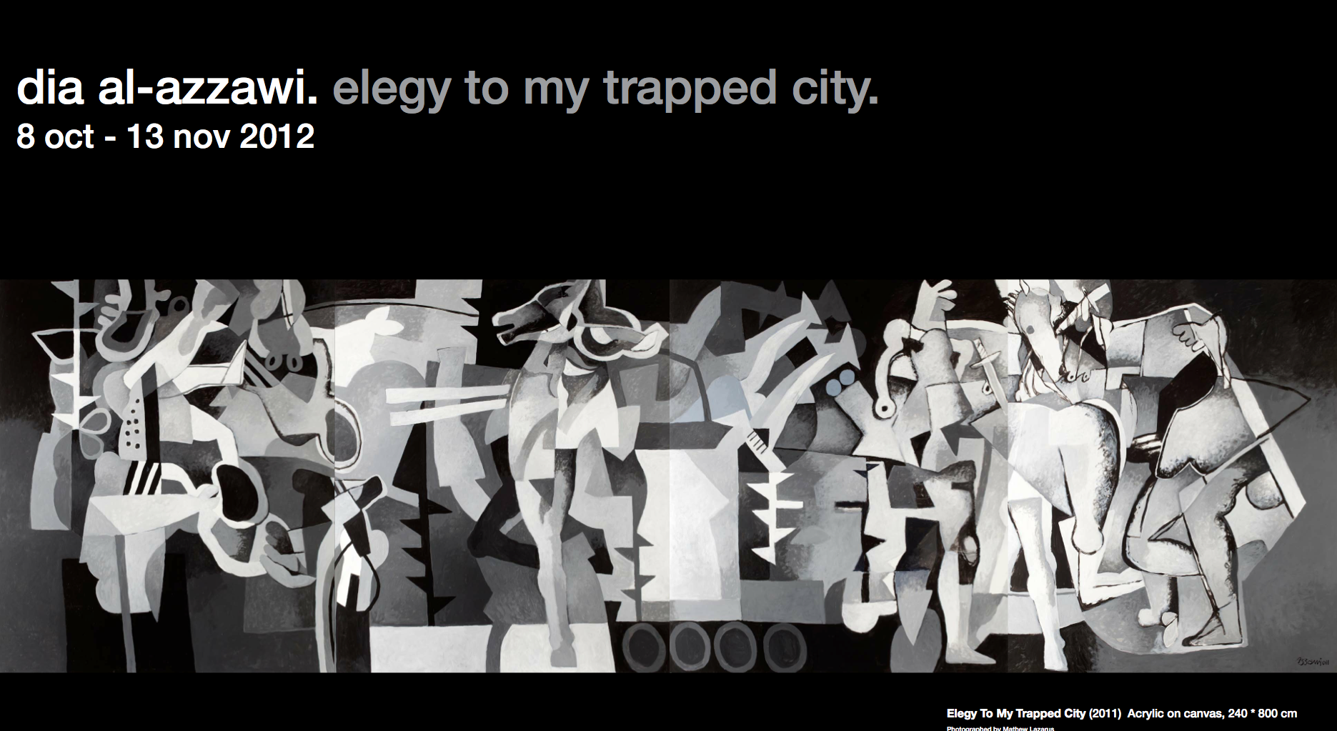 Sabra and Shatila Massacre retains that extraordinary, forensic attention to detail – to the wretched remnants of the ordinary – and it’s often compared to another, equally epic rendering of horror, Picasso‘s giant Guernica. (You can also see the parallels, I think, in the same artist’s Elegy to my trapped city (2011) below).
