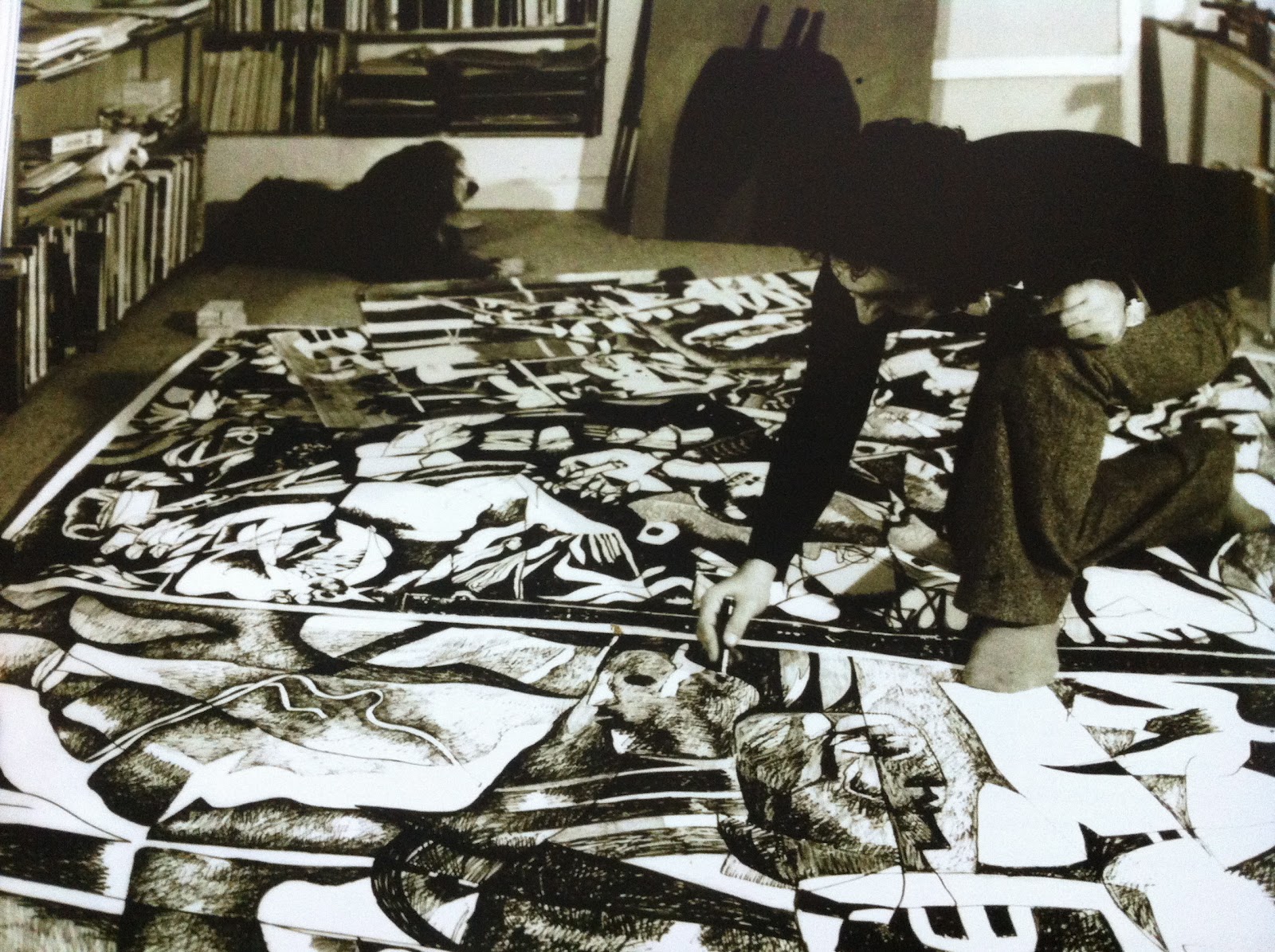 The artwork itself is copyright, and the Tate online pages describe but don’t display it, but if you click on the link to Jadaliyya above you can see it; it’s also – vividly – here, and there’s also a detail here and more here. The vast four-panelled work is a response to the massacre of Palestinians in two refugee camps in Lebanon in 1982 by Phalangist militias under the eyes of the Israeli Defense Force commanded by Ariel Sharon.