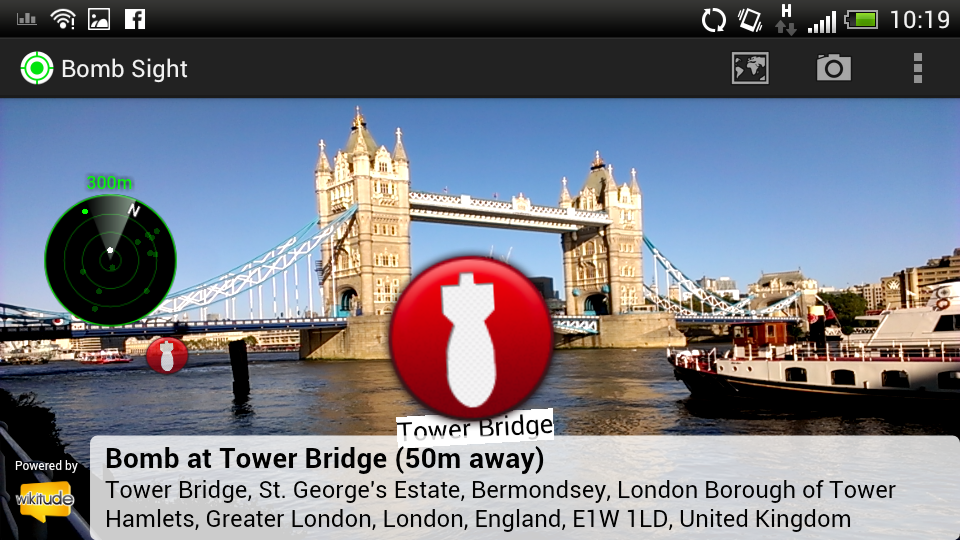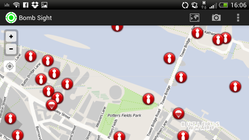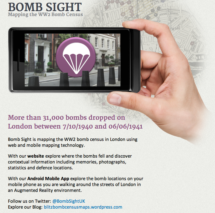 The blog recording the development of Bomb Sight includes some screen shots – I’ve pasted some below – showing detailed maps and augmented reality views that give more insight into the intended outcome.