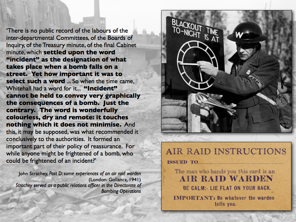 You need to ‘grow’ the markers on the map; the Guardian noted that each ‘incident’ typically involved multiple bombs. But even more telling is the word itself: ‘incident’. For, as John Strachey noted in his memoir of his time as an Air Raid Warden, it’s a bureaucratic, bloodless term:
