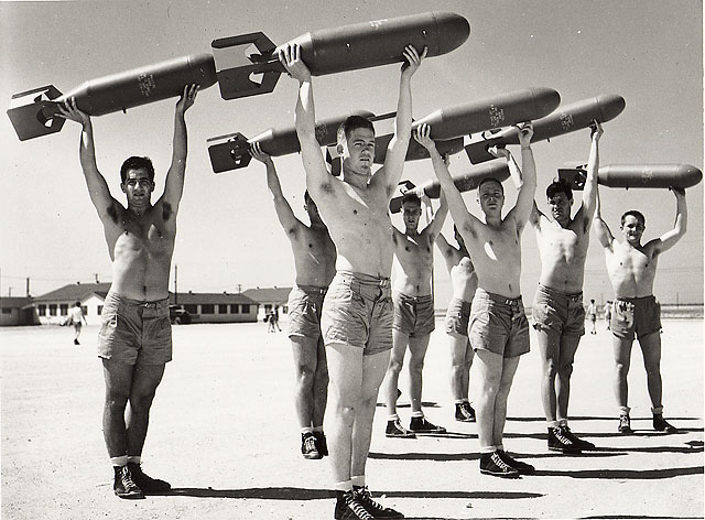 When Stanley Kubrick had Major Kong (Slim Pickens) straddle a nuclear bomb in Dr Strangelove (1964) and ride it exuberantly all the way down to its target – surely the most iconic image from the film – he was making an obvious visual point about masculinism, sexuality and military violence that, as the clean-limbed image above shows, takes many other, non-nuclear forms. Here a group of US Army Air Force bombardiers in the Second World War practices calisthenics with 100 lb bombs. A different sort of ‘love-charm of bombs‘, you might think.