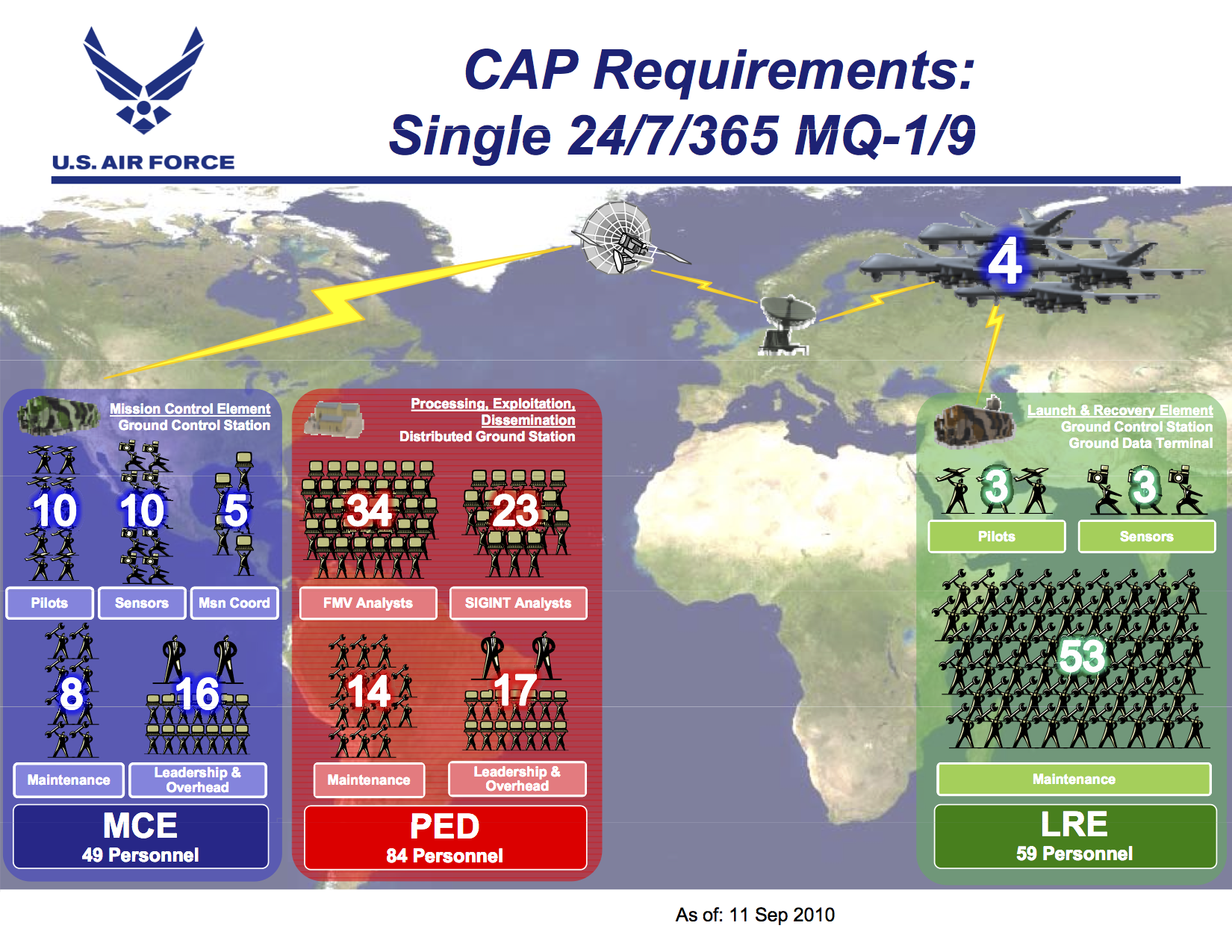 Far from being ‘unmanned’, each US Air Force combat air patrol (CAP) capable or providing coverage 24 hours a day 7 days a week involves a suite of four Predators (MQ1) or Reapers (MQ9) supported by a total of 192 personnel (the exact figures vary and are subject to change, but I’ve taken these from a June 2011 presentation by Colonel J.R. Gear, Director of the US Air Force’s Remotely Piloted Aircraft Task Force).