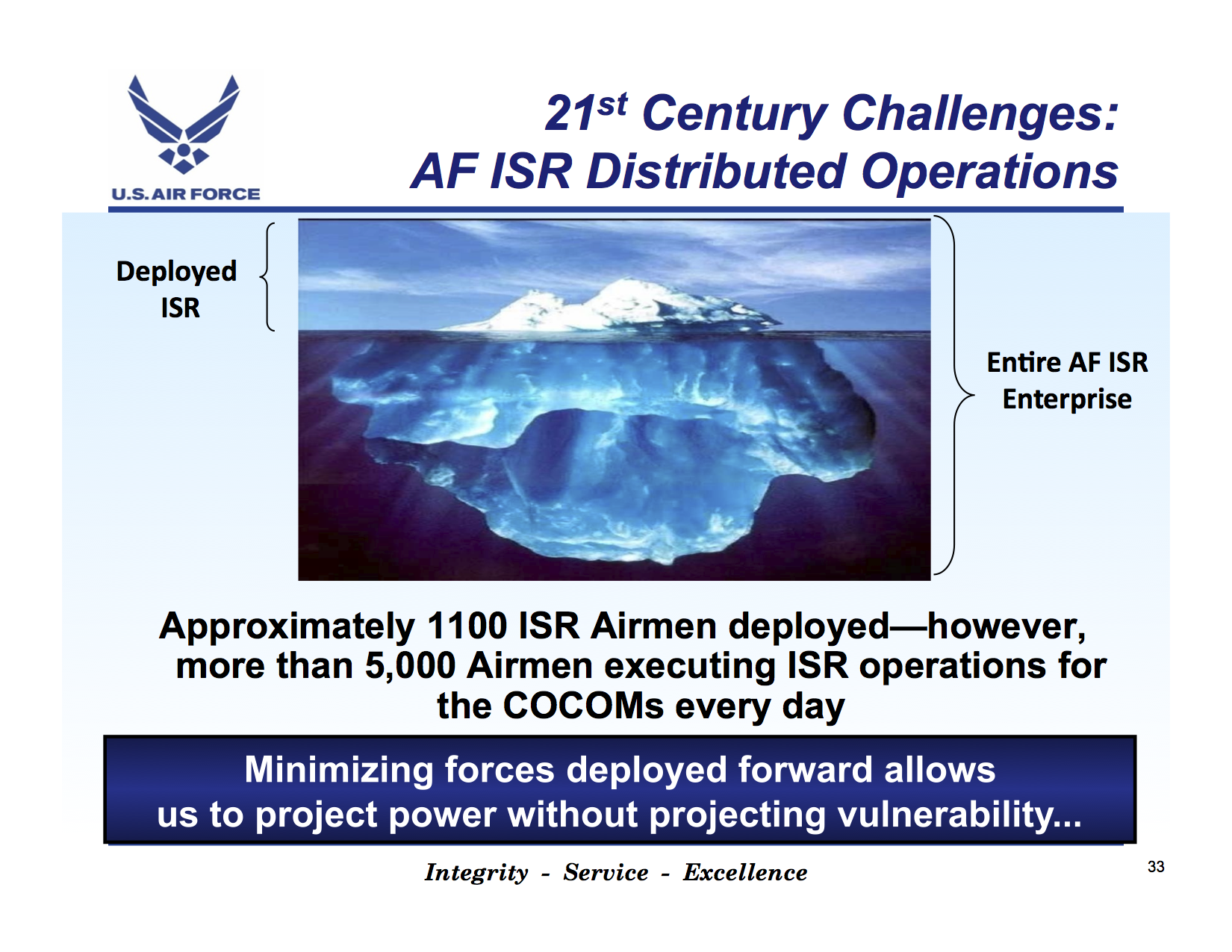As you can see from his presentation slide below, most of these (133) are based outside the combat zone, and 84 of those are devoted to ‘PED’ –processing, exploiting and disseminating the feeds from the airborne sensors, especially the full-motion video (FMV) streams.