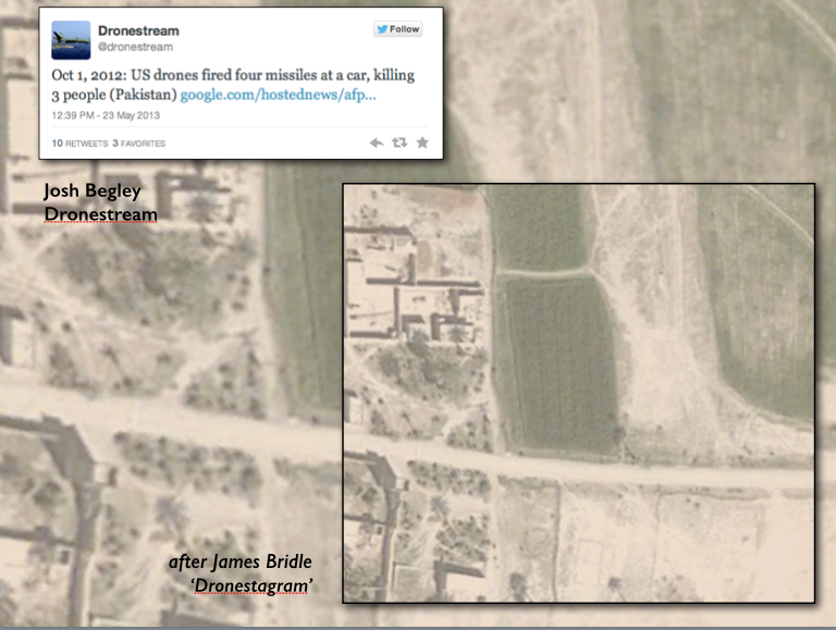 Josh, undeterred by Apple, went on to launch the Dronestream platform, from which he tweeted details of every known US drone strike. I combined one of Josh’s tweets for 1 October 2012 with a version of James Bridle‘s Dronestagram, which uses Instagram to post images of the location of drone strikes (I say ‘a version’ because Dronestagram was launched too late for this particular strike, so this is a mock-up; in any case, it’s difficult to pinpoint the locations from available reports with much precision, but the details for this strike are available via the Bureau of Investigative Journalism, as the second slide below shows):