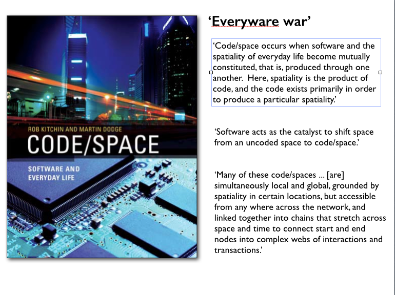 It’s not too difficult to connect the dots and draw two more general conclusions. The first is that this is another, darker dimension to the ‘code/space’ and ‘everyware’ discussed in such impressive detail by Rob Kitchen and Martin Dodge:
