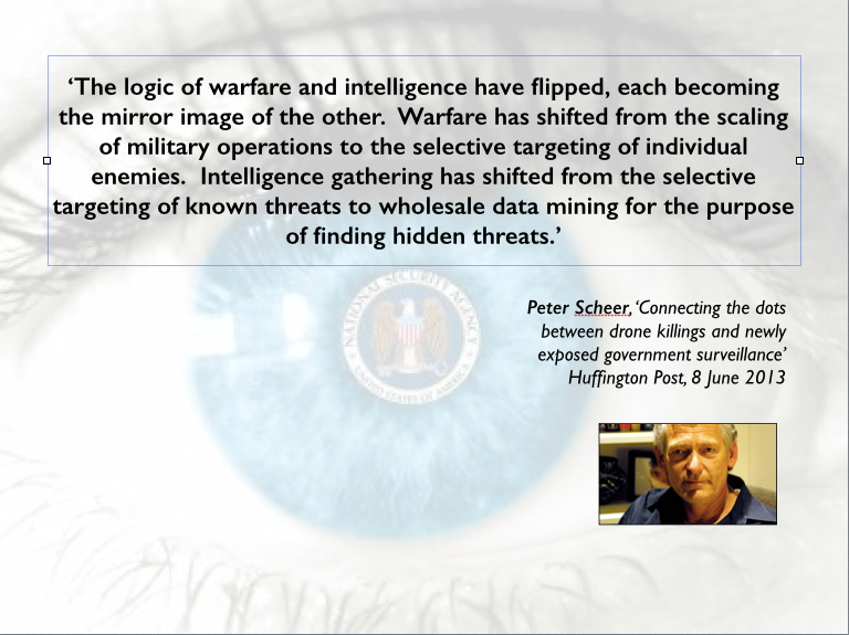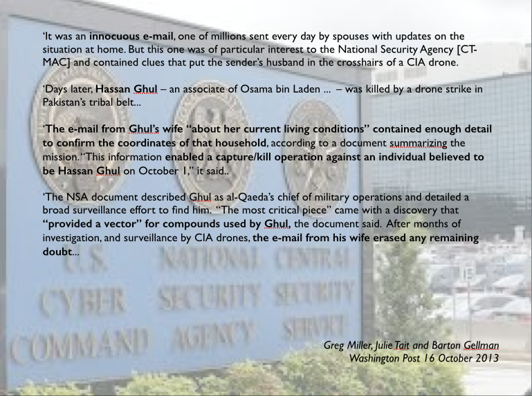 It’s a remark I’ve discussed several times before. Nagl’s ‘killing machine’ is not limited to drone strikes, of course, but subsumes the ‘night raids’ and other Special Forces operations detailed in Jeremy Scahill‘s Dirty Wars. But at York I wanted to explore how those ‘electronic means of identifying, tracking and locating’ fed into drone strikes in Pakistan: and, thanks to Edward Snowden and Glenn Greenwald, I was able to get much closer to the belly of the beast.