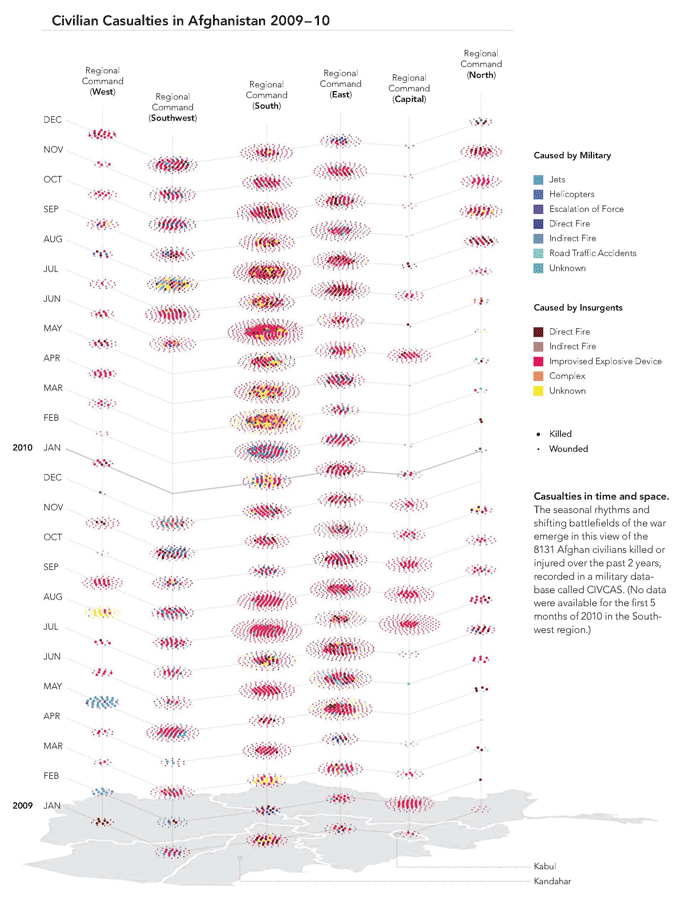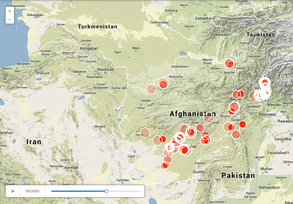 To be sure, counting casualties is always a contentious (and often dangerous) affair.  Getting information from the government of Afghanistan isn’t any more straightforward, as Nick Turse has shown: as he adds, ‘neither is it cheap’.  But he persevered, and the wonderful Pitch Interactive (a data visualization studio that also produced the haunting representation of deaths from drone strikes in Pakistan) collaborated with The Nation to produce a stunning interactive of ‘civilian deaths that have occurred in Afghanistan as a result of war-related actions by the United States, its allies and Afghan government forces.’  Here’s a screenshot: