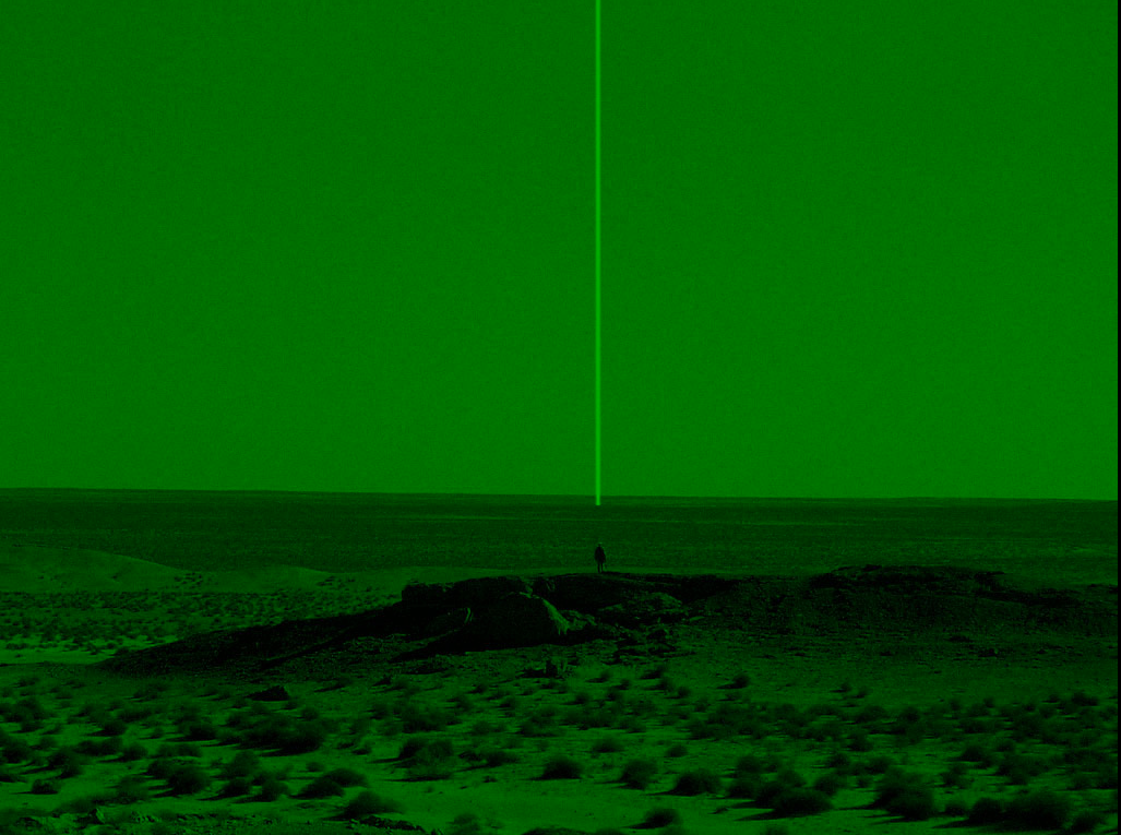 Omer Fast‘s interview with a sensor operator (‘Brandon’ –  whether this is a pseudonym or really Brandon Bryant is hard to know) for 5,000 Feet is the Best provides a series of insights into the operation in Afghanistan and Iraq.  You can’t see the beam with the naked eye, but American ground troops can see it with their infrared goggles.  According to ‘Brandon’, they call it the ‘Light of God’ (really); the image below is James Bridle‘s replication of the effect based on laser targeting night systems and a CC-licensed photograph of the Iraqi desert by Rob Bakker.