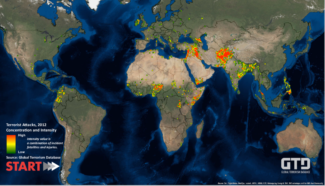 With all the usual caveats about the notoriously contentious definition(s) of ‘terrorism’,  the National Consortium for the Study of Terrorism and Responses to Terrorism (START), which has been up and running at the University of Maryland since 2005, has now geocoded its Global Terrorism Database – at least for 2012 – and from its list of more than 8,400 terrorist attacks that killed over  15,400 people its has produce this map of terrorist attacks last year: