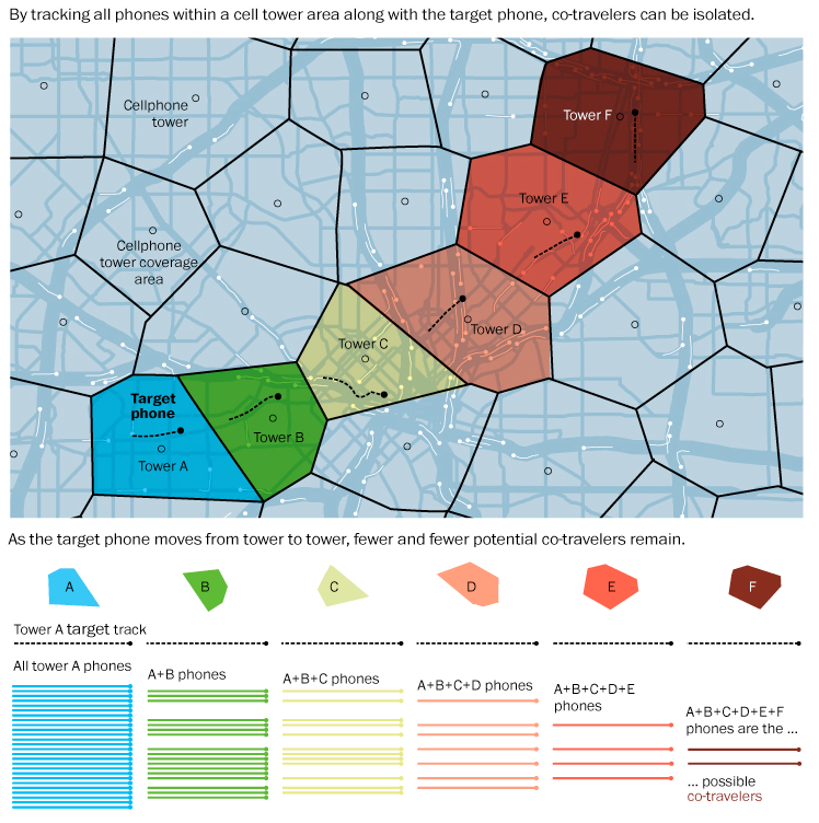 As the graphic shows, the standard method of ‘co-location analytics’ tracks not only targets but also their associates (‘co-travellers’) using cell towers (which have in turn become key targets for insurgent attack in Afghanistan partly for this reason).