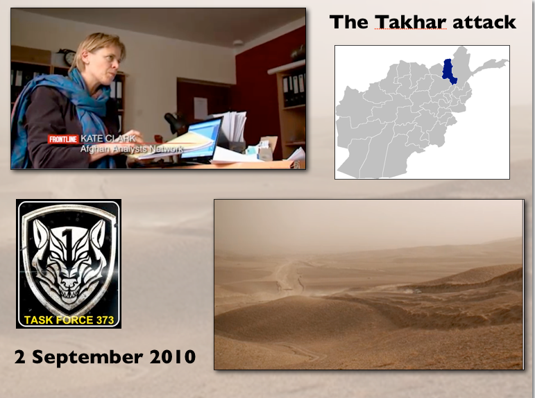 On 2 September 2010 ISAF announced that a ‘precision air strike’ earlier that morning had killed [Muhammad Amin] and ‘nine other militants’. The target had been under persistent surveillance from remote platforms – what Petraeus later called ‘days and days of the unblinking eye’ – until two strike aircraft repeatedly bombed the convoy in which he was travelling. Two attack helicopters were then ‘authorized to re-engage’ the survivors. The victim was not the designated target, however, but Zabet Amanullah, the election agent for a parliamentary candidate; nine other campaign workers died with him. Clark’s painstaking analysis clearly shows that one man had been mistaken for the other, which she attributed to an over-reliance on ‘technical data’ – on remote signatures. Special Forces had concentrated on tracking cell phone usage and constructing social networks. ‘We were not tracking the names,’ she was told, ‘we were targeting the telephones.’