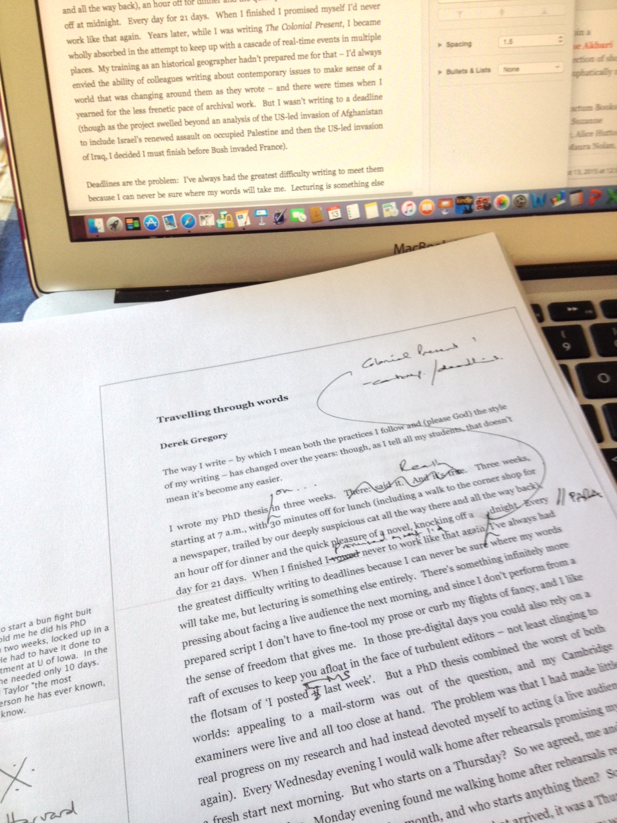 photo-3So it’s back to the keyboard – and back to the beginning of the manuscript. I rework my original pages, and by the time I’ve finished (scribbling on my original storyboard and annotating the map while I’m writing the essay, adding footnotes which will sometimes make it into the finished version but are just as likely to be notes to myself, and pushing further out into the unknown) those three or four pages will have grown to six or seven. I use footnotes constantly, sometimes as commentary, often as placeholders for paragraphs to be drafted in the next round of revisions, and always as a holding pen for references. I never use the Harvard reference system while I’m composing – to me, the arch-enemy of good writing [see Gregory D (1990)] – and the final labour of transforming (deforming) my prose into the obstacle course of brackets, names and dates required by most journals is the most depressing part of the whole business. Once my six or seven pages are on the screen the cycle starts again: back to the beginning, editing, annotating, moving some of those footnotes into the text (which is often the best place for them) and composing another three or four pages, slowly pushing on.
