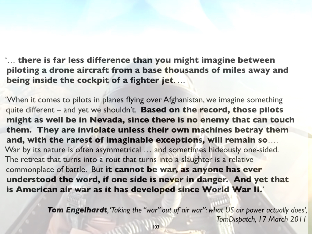 I think this is an even more successful attempt to render the corporeality of war through its objects than Tim O’Brien‘s brilliant account of Vietnam in The Things They Carried (for more, see my post on ‘Boots on the Ground‘ and my essay on ‘The natures of war’: DOWNLOADS tab). This is, in part, because the narrative is not confined to those objects close to Barnes’ own body; it spirals far beyond them to include a drone providing close air support (‘I banked around the area and my sensor zoomed out again and I could see the enemy in relation to the soldiers who needed me’) and, significantly, extends to the components of the IED and the bodies of the insurgents who constructed and buried it.