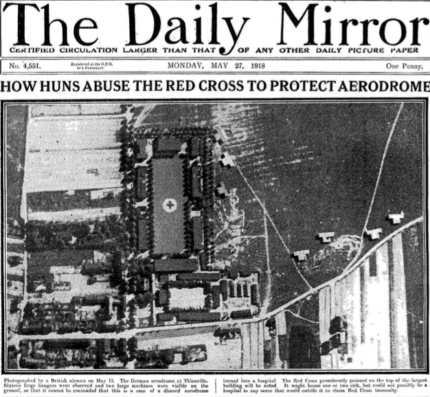 The aerial photograph was taken on 15 May 1918, and the caption described this as an active aerodrome at Thionville; the large building displaying the Red Cross ‘might house one or two sick’ but the Mirror insisted it ‘could not possibly be a hospital in any sense that would enable it to claim Red Cross immunity.’