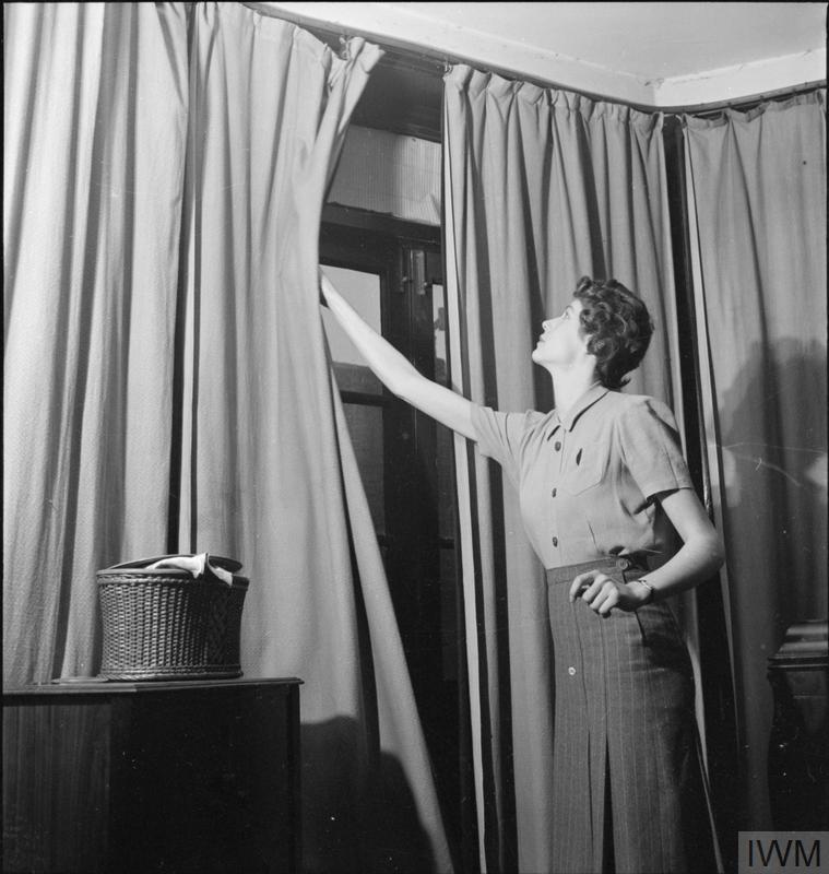 Households were required to make special blackout curtains; they could not be washed, because this would let the light through, so housewives (sic) were enjoined to ‘hoover, shake, brush then iron them.’ The windows had to be closed to secure the blackout too, so rooms soon became airless. Chris Hill has the reaction of a teenage girl living in Romford, recorded in her diary for Mass Observation:
