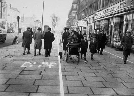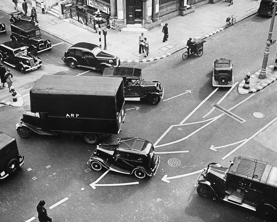 In addition, as Geoff Manaugh demonstrates, both the flow and the fabric of the city were reconfigured: a 20 m.p.h. speed limit was imposed, blue lights marked public air raid shelters, and new white markings appeared on roads to guide the traffic: