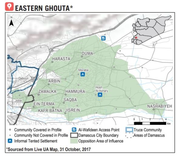 They are concentrated in towns and cities. Many people have managed to escape areas under siege, risking their lives to do so, but many others have sought refuge in towns and cities that have themselves come under siege. Here, for example, is Siege Watch‘s description of Eastern Ghouta in mid-2016: