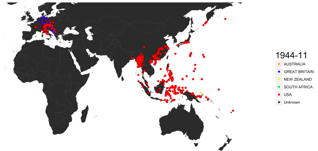 On the global scale, Data Is Beautiful has a GIF showing ‘every bomb dropped by Allied forces in World War II); you can view it as a video here, from which I’ve grabbed these screenshots that capture the shift from the European to the Pacific theatre: