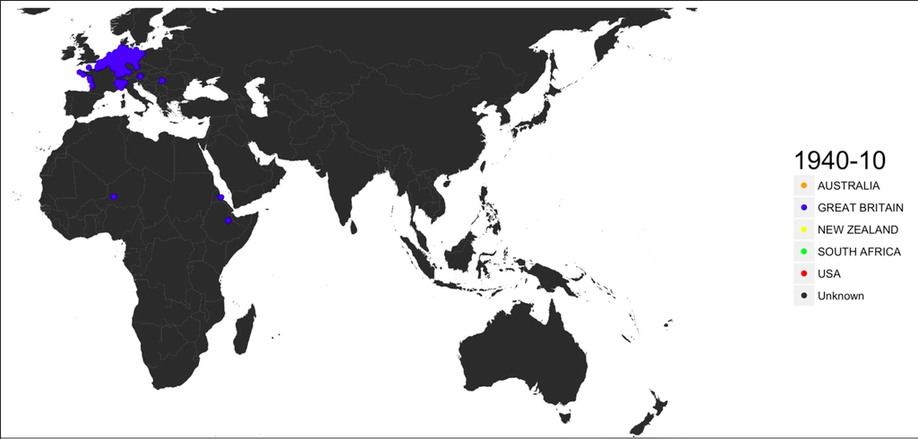 The map comes without a key; all I know is that the original tabulations include ‘U.S. and Royal Air Force data, as well as some Australian, New Zealand and South African air force mission’ 1939-1945 and refer to tonnages dropped: more discussion here.