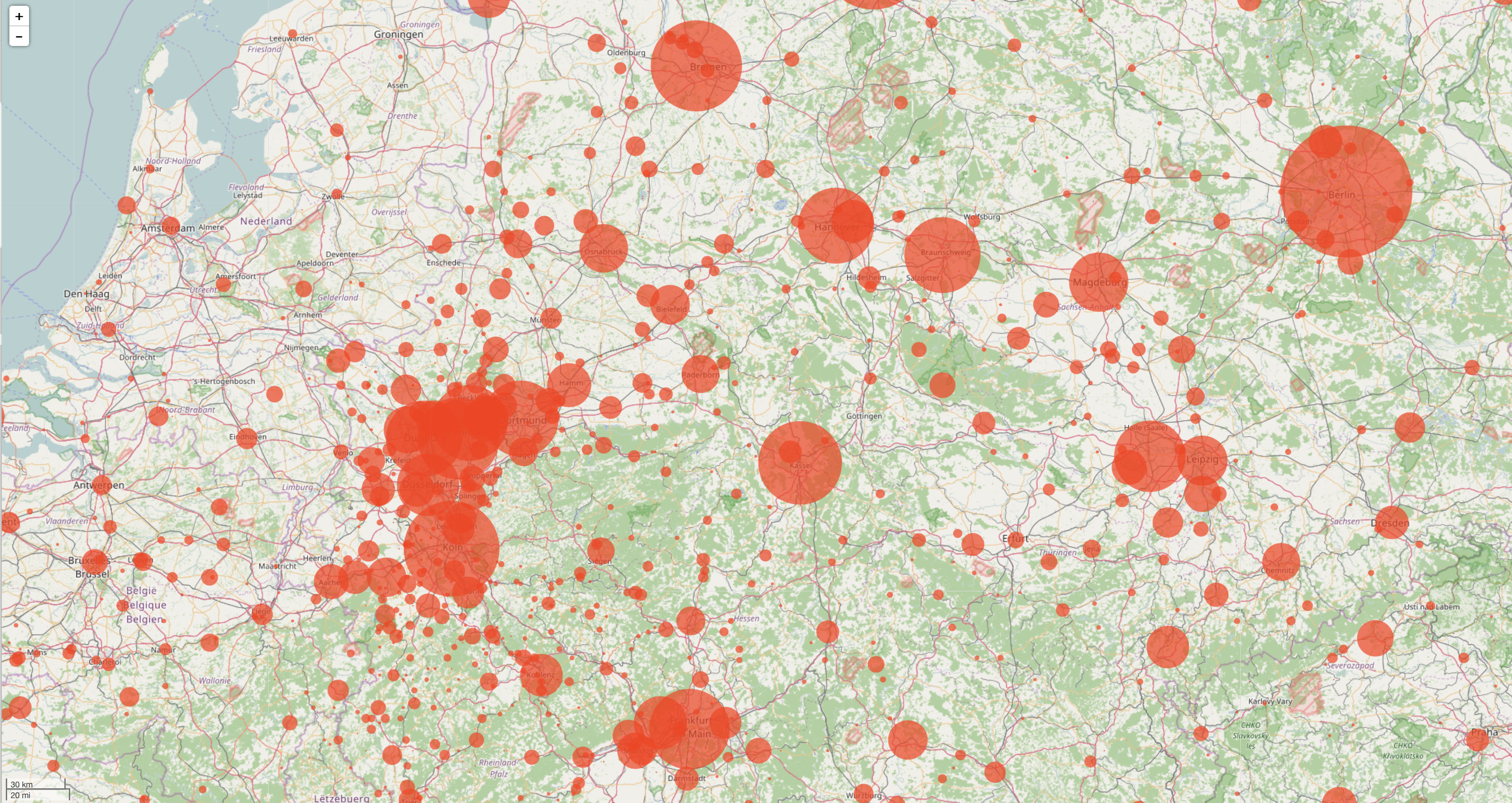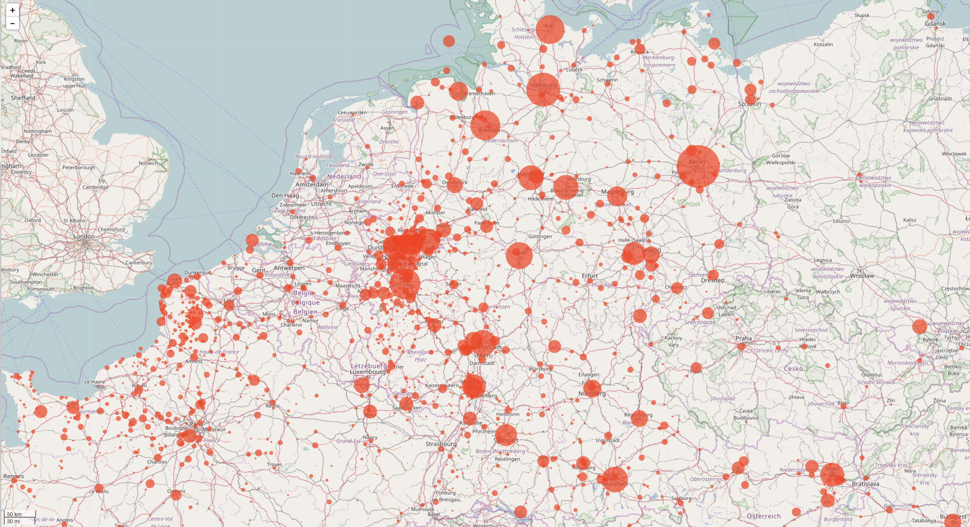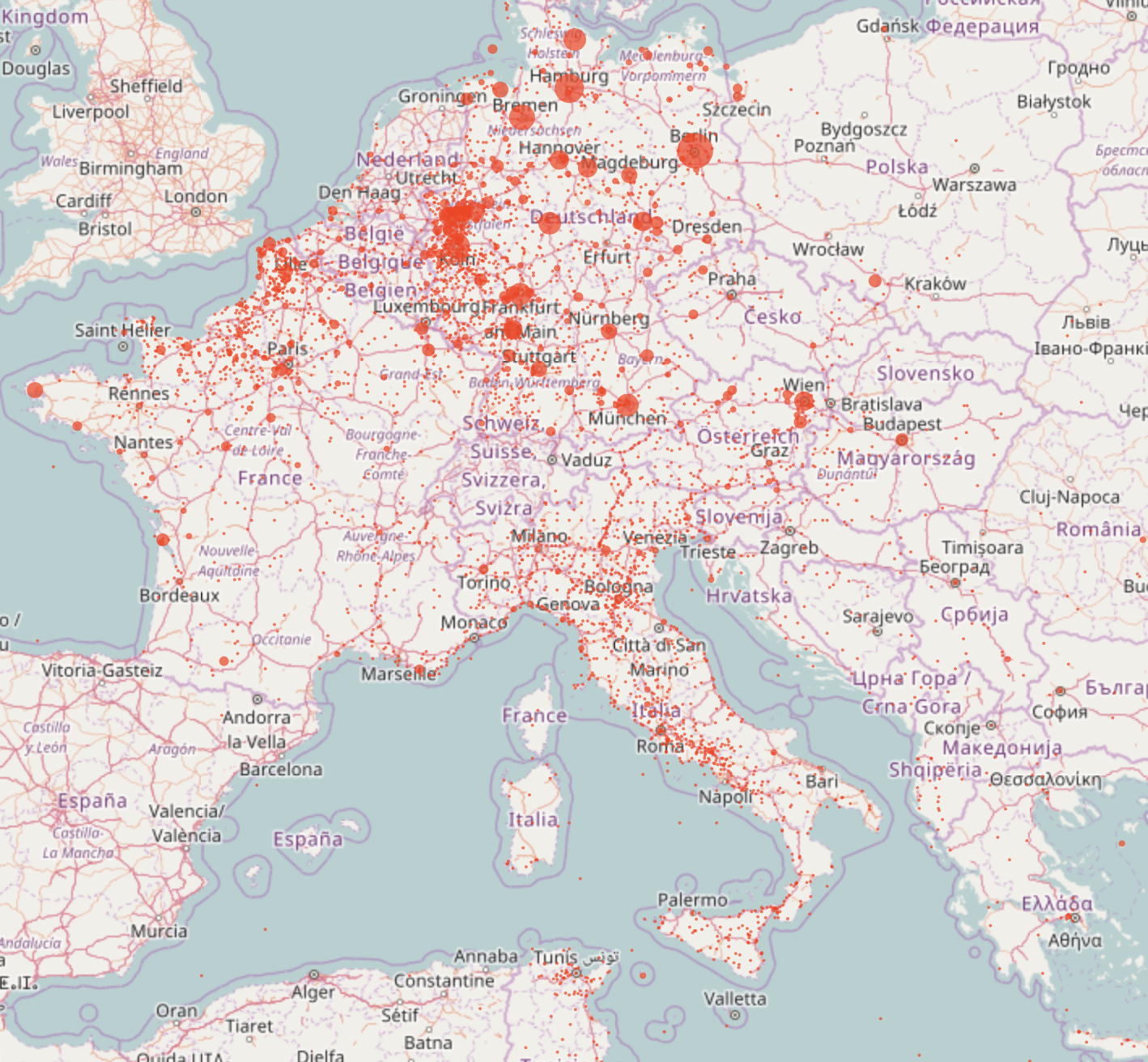 UPDATE: I’ve since discovered this map of Allied bombing raids over Europe in the Second World War by Dimitri Lozeve, also drawn from Data.mil’s THOR database (click on the link for an enlarged version):