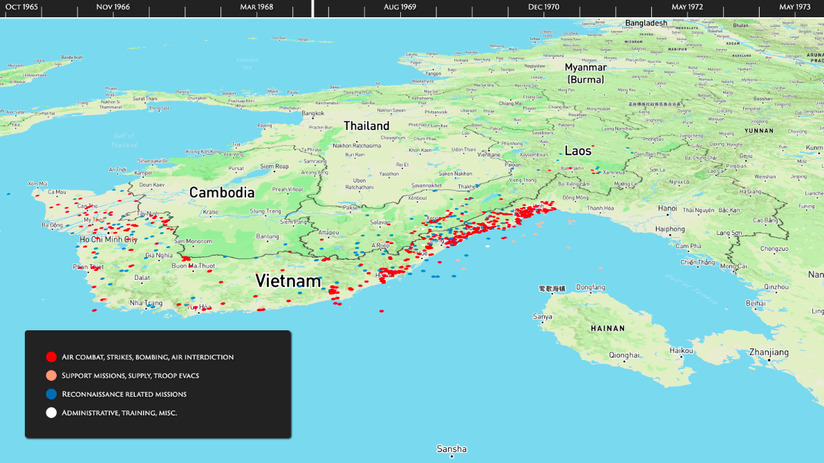 By giving the user a bird’s eye view, we can clearly see up and down the Vietnamese peninsula, and the neighboring countries of Laos & Cambodia, and precisely see where these missions took place.