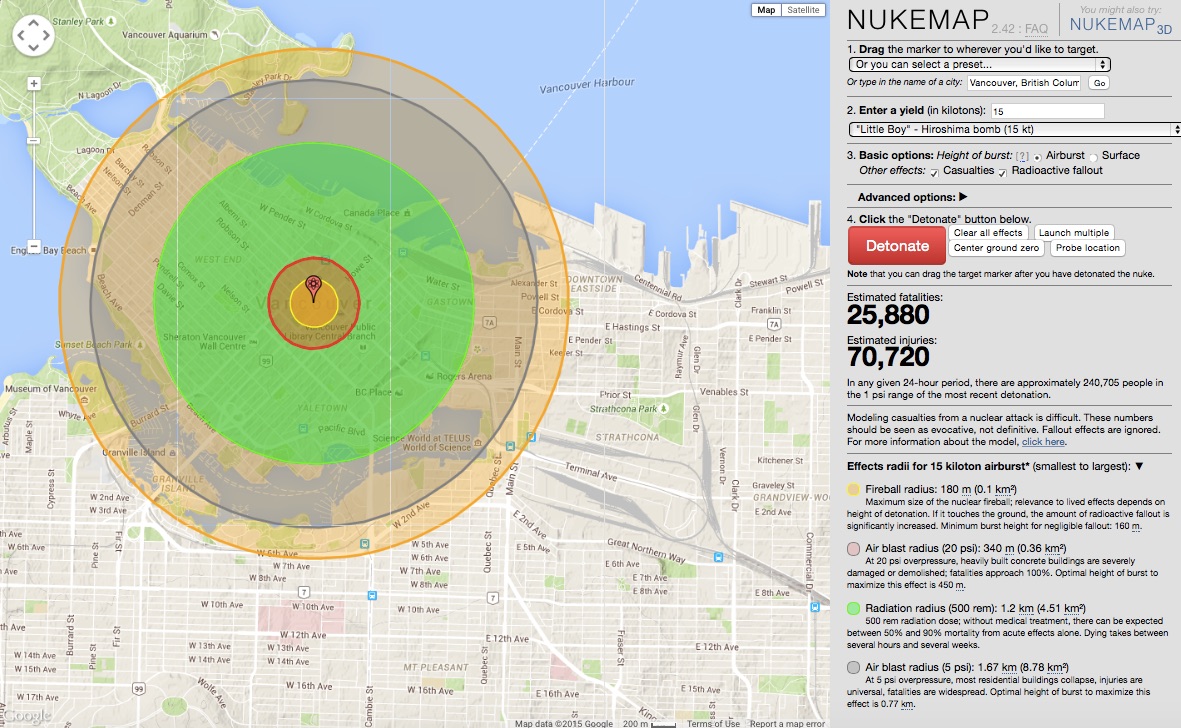 Among Alex’s visualizations is NUKEMAP, which simulates the dropping of ‘Little Boy’ on other towns and cities.  Here is downtown Vancouver (for a discussion of airbursts, see Alex’s post here).