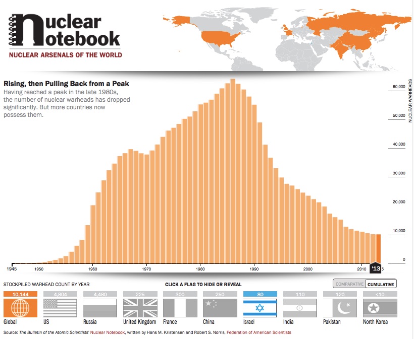 Many of today’s warheads are much smaller – the missiles carried on Trident, for example, are around 100 kilotons.   But that’s small comfort.  If you want to know how many nuclear warheads there are in the world today, this chart from the Nuclear Notebook produced for the Bulletin of Atomic Scientists will give you a rough idea (the interactive version is here):