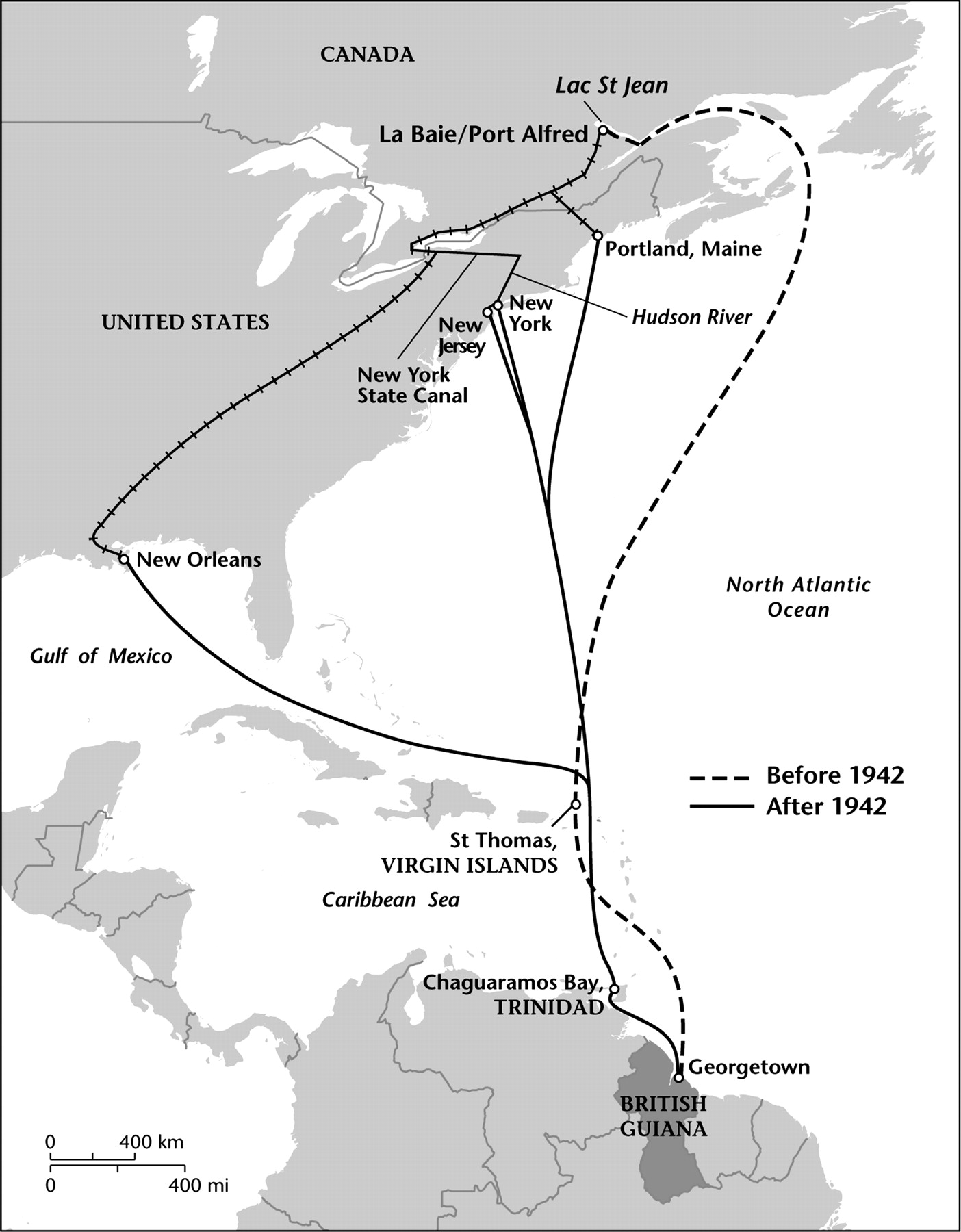 Matthew describes in detail a commodity chain that started in British Guiana (which provided most of the bauxite used in North America’s smelters), and reached across the Caribbean to the eastern seaboard of the United States, where it was transported by rail into Quebec for smelting.  The ingots were then shipped out to rolling mills and fabricating plants in Canada and the United States, across the Pacific to Australia, or across the Atlantic to Britain.  As he emphasises, the chain was militarised at every point, and a primary concern was to secure the supply chain by providing air cover or convoy escorts: the great fear was of a U-Boat attack.  The map below, taken with permission from Matthew’s essay, “reminds us of the unprecedented capacity of the Second World War to gather and scatter materials with untold human and environmental consequences, linking diverse locations with no necessary former connections.”  And here too, as I argued in a previous post, the friction of distance is no simply physical effect: it is shot through with political, economic and strategic calculations.