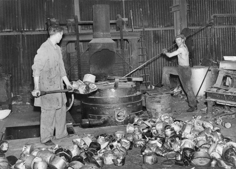 ‘Although these contributions were to be voluntary, the timing of the appeal, its tone, and the manner in which it was put forward left the impression that the country’s need for scrap aluminum was urgent. As a result, the response from the housewives was immediate and their contributions were reported to be of quite considerable proportions.  Almost as prompt were the criticisms and complaints raised from trade and parliamentary quarters, as well as by some groups of skeptical housewives. Thus many scrap metal merchants became indignant when the appeal was made, calling attention to the tons of scrap in their yards for which they were unable to find a market. To this objection it was pointed out in Parliament that not all aluminum scrap was suitable for use in aircraft production. This limitation was especially true for the scrap held by these dealers, whereas that obtained from household utensils was excellent for this purpose.’