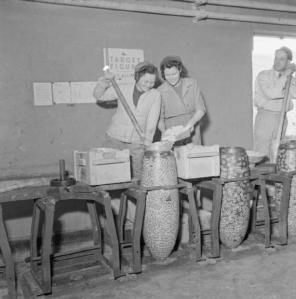 Incidentally, those who yearn for a time when air forces have to raise funds through bake sales might contemplate the “Wings for Victory” campaign, and its enlistment of children to contribute savings stamps for the purchase of new bombers.  When one of these aircraft was exhibited in Trafalgar Square in 1943, children lined up to plaster their stamps all over a thousand-pound bomb.  Here – as in the clarion call for the nation’s saucepans – war becomes domesticated, even homely.  War enters the domestic interior in countless other ways of course – through air raids, conscription, evacuation, and rationing, for example – but the enrollment of everyday objects, like savings stamps and saucepans, contrives to make violence not ‘harmless’ exactly but certainly ordinary, mundane, as this photograph from the Imperial War Museum shows.  Here two women factory workers fill bombs covered in savings stamps in what, to my eyes at any rate, looks like a ghastly parody of cooking; the biggest so-called ‘blockbuster’ bombs were called “cookies”, perhaps not incidentally, and aluminium was a vital component in many explosive mixes too.