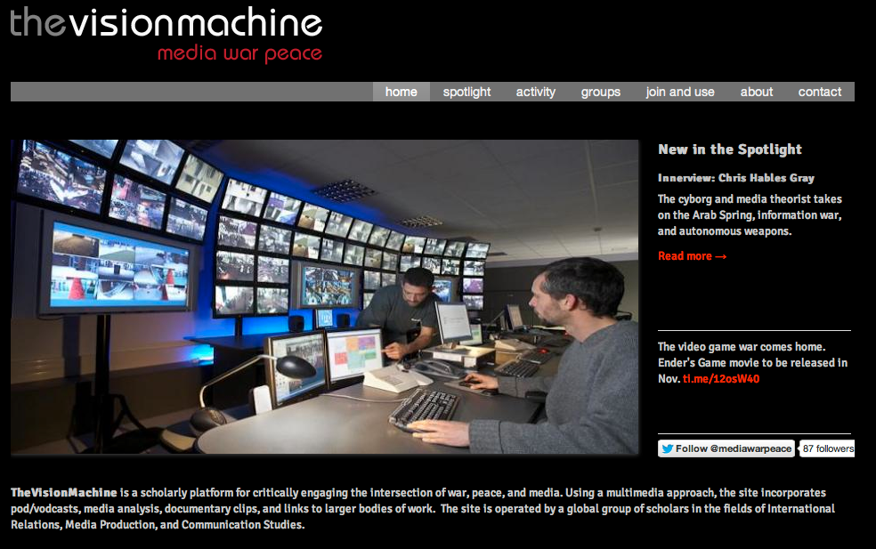 TheVisionMachine is a scholarly platform for critically engaging the intersection of war, peace, and media. Using a multimedia approach, the site incorporates pod/vodcasts, media analysis, documentary clips, and links to larger bodies of work. The site is operated by a global group of scholars in the fields of International Relations, Media Production, and Communication Studies.