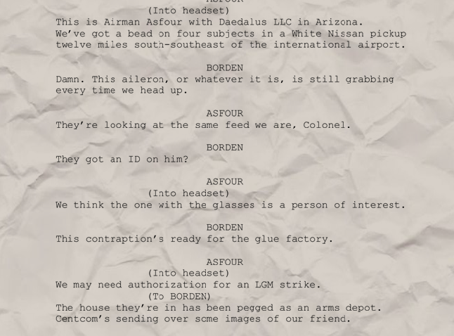 The play takes place principally in a single-wide trailer painted with desert camouflage in the desert in the American West. Other scenes take place in an automobile and in other locations, which should be created with music and light. The play is written so that it may be staged with two office chairs. The set should be minimal. There is no reason to create a realistic “cockpit” since the flyers are not really in a cockpit and they are not flying. Their workspace resembles the cubicles of millions of other office workers. Outside the trailer, Stage Left, is a sign with a series of crudely painted arrows, which say: Kandahar 6792, Las Vegas 473, Mogadishu 5712, Phoenix 173, etc. Several actual props are introduced in the course of the play—a couple of unmarked white milk shake cups with straws, a fox stole etc.—and the two characters could wear minimalist headsets with microphones so as not to create confusion about when they are talking to Central Command. However, since the play is – among other things – about the relationship between the real world and the virtual world, all other machines, including phones, computers, navigational equipment, monitors should be mimed and/or created with light.