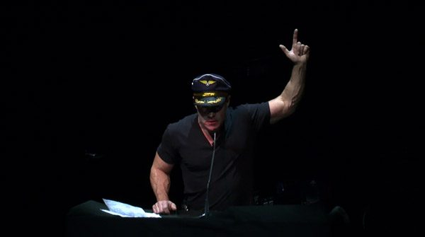 Unmanned is about the changing nature of masculinity in the face of automated technologies of war. It focuses on the unmanned aerial system, or drone, as a site of investigation. Rather than taking a conventional analytical approach, however, the work is performed live as “philosophical theater”: a blend of performance art, political allegory, philosophical speculation, and intimate reverie. Jordan Crandall conducts a series of monologues in the guise of seven different characters, supplemented with stage action, video, and sound. Each character is an archetype of masculine identity struggling with its own agency and role in the field of deployment — historically the most complex issue in the field of military endeavor.