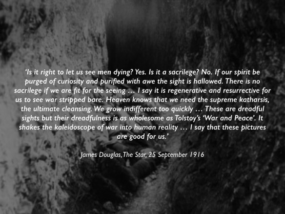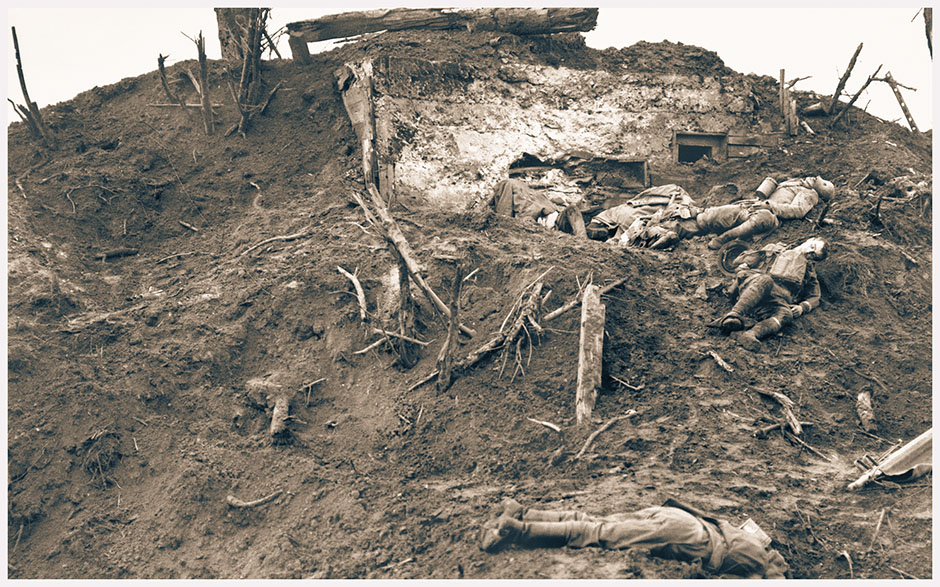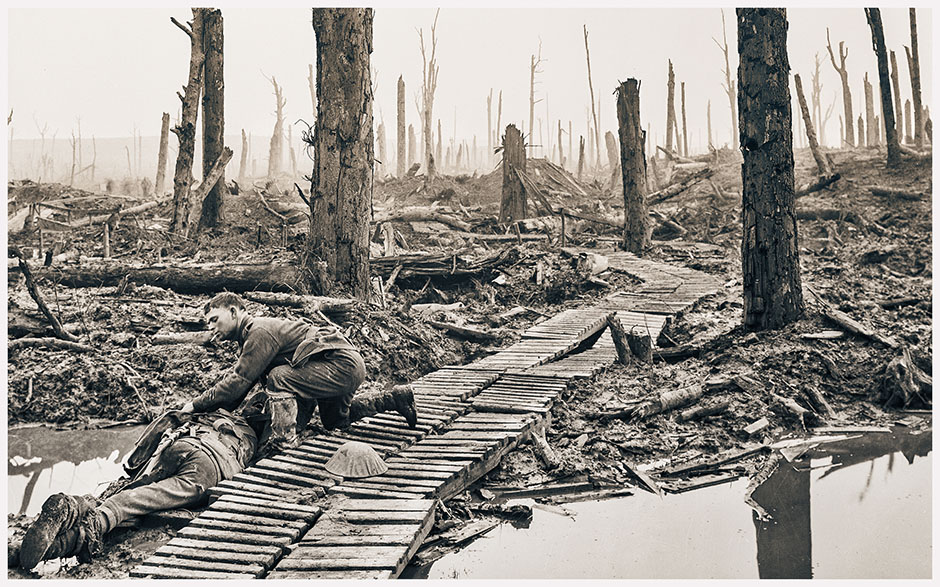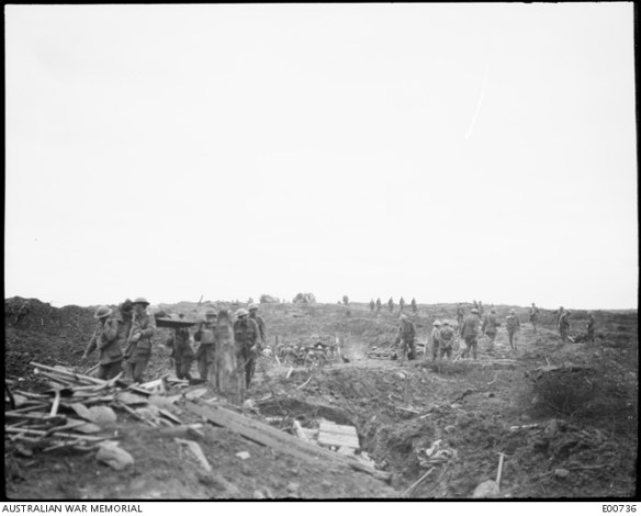Three weeks after Dugmore’s observation, and not far from his position, a wounded Australian soldier making his way from aid post to dressing station described the same awful scene but in a different, animate register: