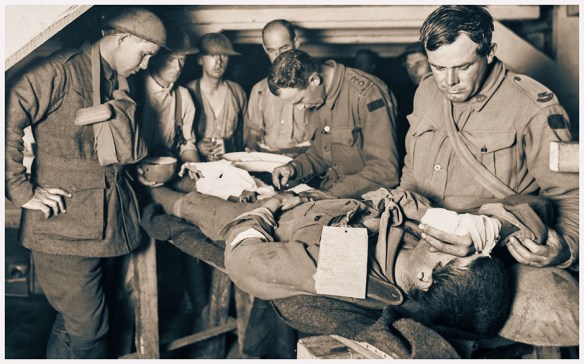 If they were fortunate the wounded would have others for comfort and company while they waited, but all any of them had for first aid was a field dressing and an ampoule of iodine. Capt Harold McGill reckoned that ‘the obsessing fear of the men was death from hemorrhage’ – understandably so in the absence of effective blood transfusion until late in the war – and the field dressing was the first vital response to bring bleeding under control. [18] One soldier explained: