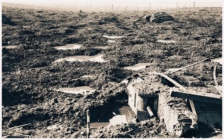 ‘I felt … that I had been hit by a tremendous iron hammer, swung by a giant of inconceivable strength, and then twisted with a sickening sort of wrench so that my head and back banged on the ground, and my feet struggled as though they didn’t belong to me. For a second or two my breath wouldn’t come. I thought – if that’s the right word – “This is death”, and hoped it wouldn’t take long. By-and-by, as nothing happened, it seemed I couldn’t be dying. When I felt the ground beside me, my fingers closed on the nose-cap of a shell. It was still hot, and I thought absurdly, in a muddled way, “this is what has got me”. I tried to turn on my side, but the pain, when I moved, was like a knife, and stopped me dead. There was nothing to do but lie on my back.’ [12]