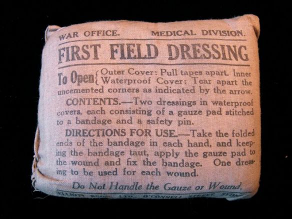 ‘The first field dressing which each man carries sewn in the lining of his tunic has saved many lives. Comprising as it does two pads of gauze and cotton-wool and a bandage, it can be ripped out of its case and clapped on to the wound, and so save the injured man, who may have to lie out hours before he can be taken back to a dressing-station, many risks from loss of blood or outside infection.’ [19]