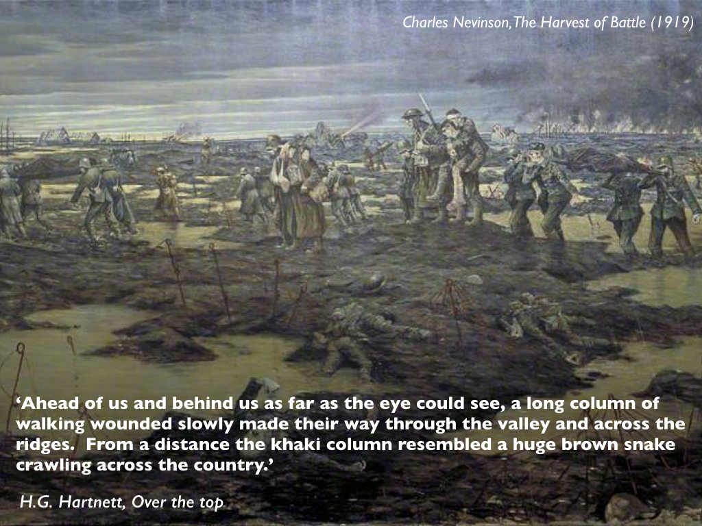 Given the cascading combination of immediacy, difficulty and uncertainty it is scarcely surprising that the space of the wounded should have contracted so drastically. And yet at the same time that space expanded, partly through what had become the taxing task of traversing even a short distance to relative safety, and partly through the tantalizing prospect of a ‘Blighty’, a wound judged sufficiently serious to require evacuation to Britain (and perhaps beyond for troops who came from elsewhere in the Empire). [22]