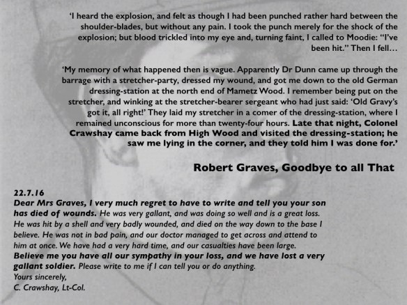 [13]Graves confessed that his memory of what happened next was ‘vague’. He was not expected to survive, and was taken to a dressing station where he remained unconscious; when his commanding officer went down and saw him lying in a corner ‘they told him I was done for.’But the next morning an ambulance took Graves to a Casualty Clearing Station, where he remained until 24 July when he was put on an ambulance train for a Base Hospital on the coast and was eventually repatriated to Britain. Meanwhile his commanding officer had written to his mother tendering his condolences at the loss of her son. Robert Graves, Goodbye to all that (London: Penguin, 2000; first published in 1929) pp. 180-2.