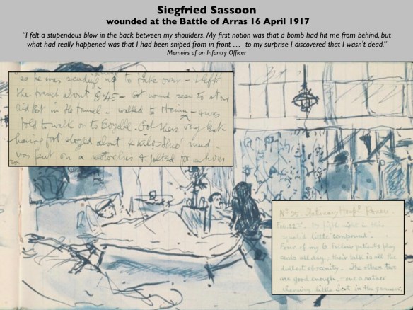 His friend Lt Siegfried Sassoon’s reaction to being wounded during the Battle of Arras the following year)was much the same. He too knew at once that he had been hurt, even if he was not sure how. ‘No sooner had I popped my silly head out of the sap,’ he wrote much later, ‘than I felt a stupendous blow in the back between my shoulders. My first notion was that a bomb [grenade] had hit me from behind, but what had really happened was that I had been sniped from in front…To my surprise I discovered that I wasn’t dead.’ [14]