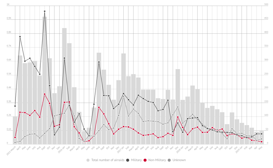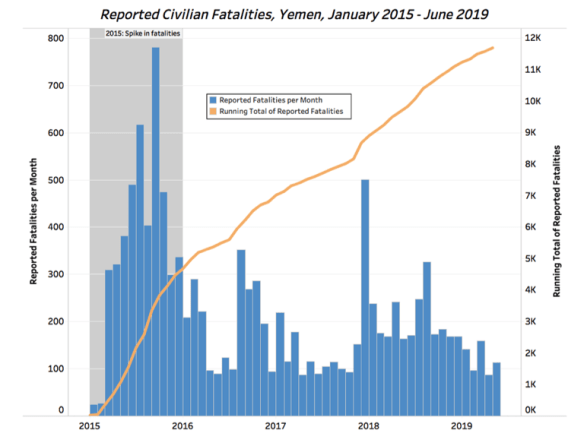 ACLED notes: ‘Around 67% [over 8,000] of all reported civilian fatalities in Yemen since 2015, resulting from direct targeting, have been caused by Saudi-led coalition airstrikes, making the Saudi-led coalition the actor most responsible for civilian deaths…. Air and drone strikes were especially deadly for civilians in 2015 and during the Hodeidah offensive in 2018.’