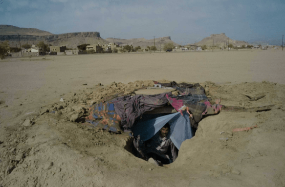 Several years ago we were in Dubrovnik and visited War Photo‘s mesmerising exhibition space in the old town; part of it was devoted to a permanent exhibition documenting the wars in the former Yugoslavia, but part of it was given over to a visiting exhibition by Maria Turchenokova. One image has haunted me ever since: two or three desperately young Yemeni children, standing in a narrow, shallow crevice in the ground, half-covered by a sheet of rusted corrugated iron: this was their ‘air raid shelter’. I’ve since searched for the image many times, without success; this isn’t it, but the photograph (of a man peering out of a “shelter” on the outskirts of Saada in 2015) conveys something of the vulnerability of ordinary Yemenis: