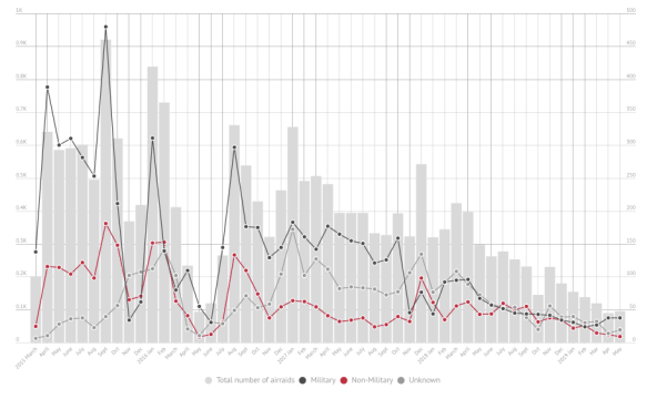 The Yemen Data Project provides this timeline of air strikes (there’s also an interactive map by governorate on the same page):