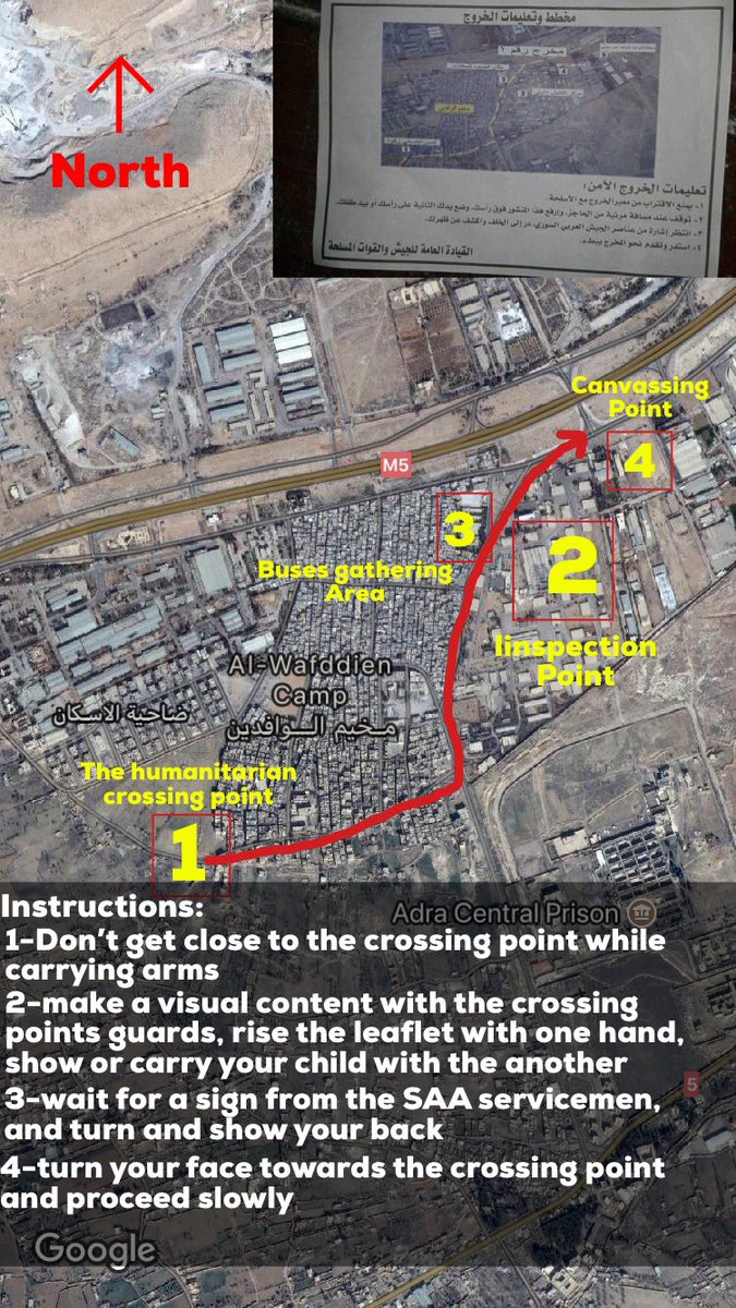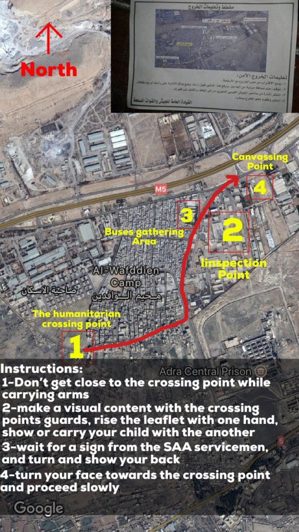Amidst this mounting chaos Syrian Arab Air Force helicopters were dropping thousands of leaflets (original and translation below) on Douma and the surrounding area calling on civilians to leave through a ‘humanitarian corridor’ that would be opened via the al-Wafideen crossing during a daily truce between 9 a.m. and 2 p.m., starting on 27 February: